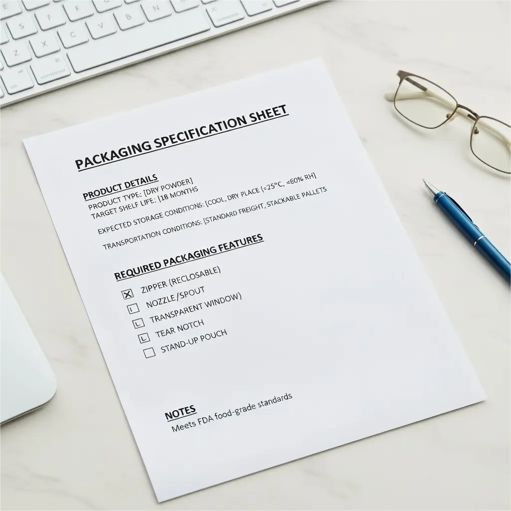 Before contacting the supplier, please prepare a specification sheet that includes the following information: product type (dry, liquid, paste), target shelf life, expected storage, transportation conditions, and required features (zipper, nozzle, valve, window). If your product is sensitive to moisture or oxygen, please add the target MVTR and OTR values.