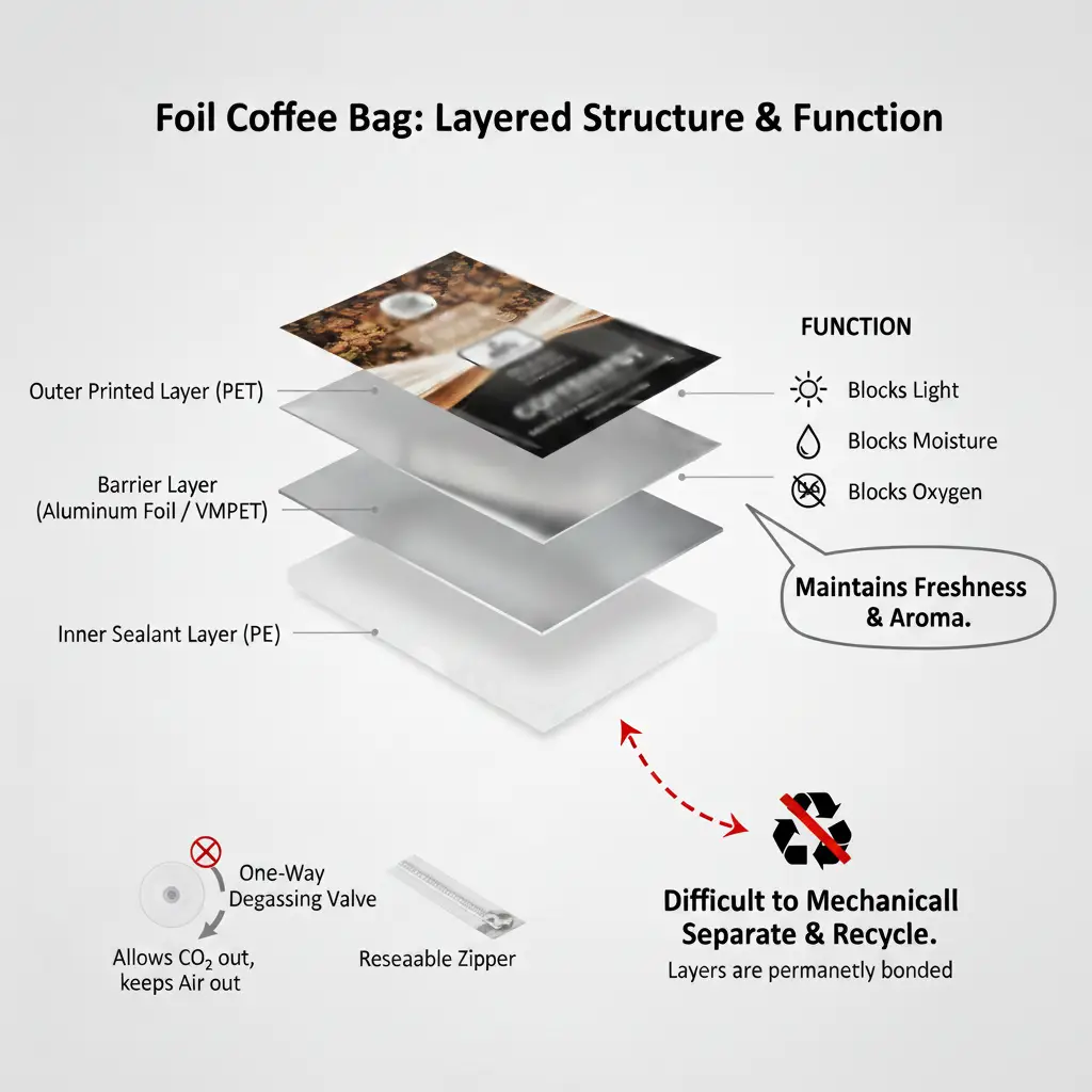 So while components of a foil coffee bag (e.g., PET or PE layers) are recyclable in principle, the composite structure means most end up in landfill, energy recovery, or specialty recycling streams—not in standard curbside recycling.